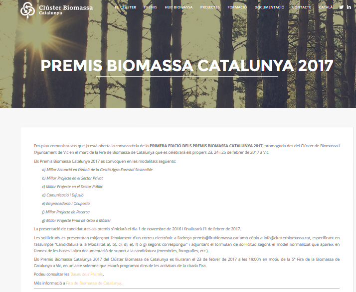 Premis Biomassa 2017 https://eeabb.upc.edu/ca/Portada/noticies-als-mitjans-i-cursos-del-sector/curs-2016-2017/premis-biomassa-2017 https://eeabb.upc.edu/++resource++plone-logo.svg Comparteix: Premis Biomassa 2017 Informació detallada a http://www.clusterbiomassa.cat/premis-biomassa-catalunya-2017